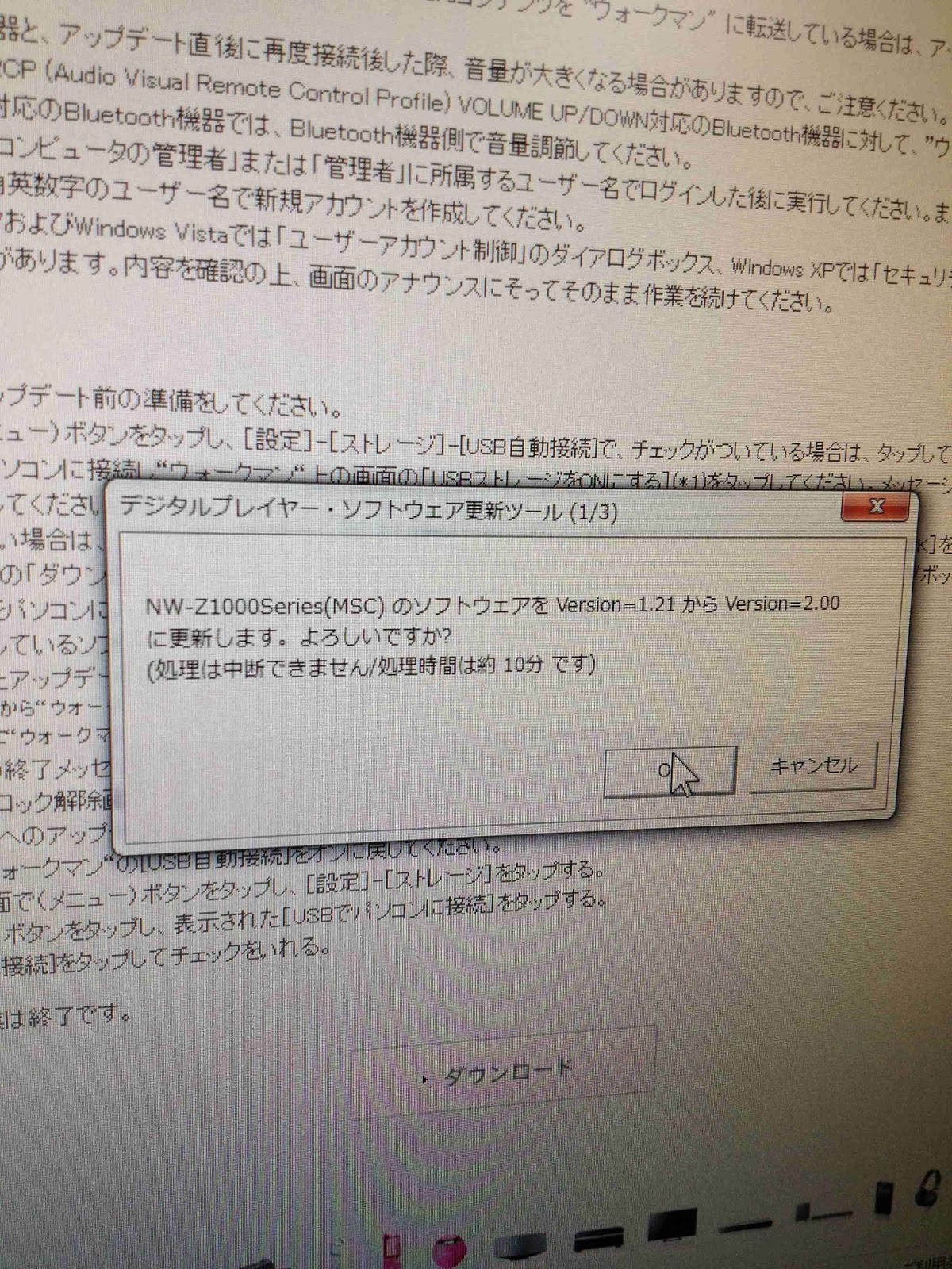 「NW-Z1000Series(MSC)のソフトウェアを Version=1.21から Version=2.00に更新します。よろしいですか?」